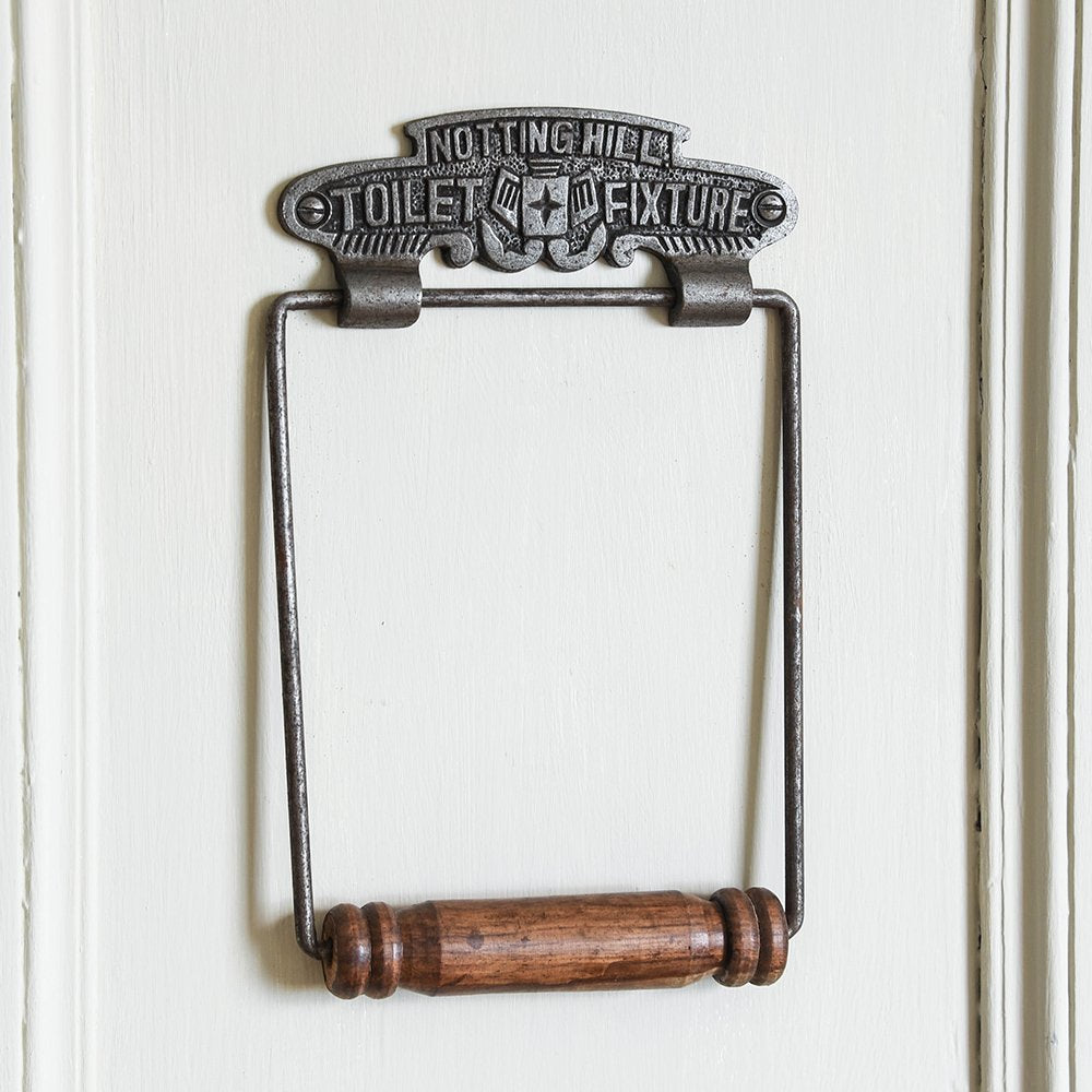 Authentic wire toilet roll holder with cast iron plaque. The decorative embossed lettering brings a certain charm to an everyday object. A finishing touch to a traditional style cloakroom or bathroom.