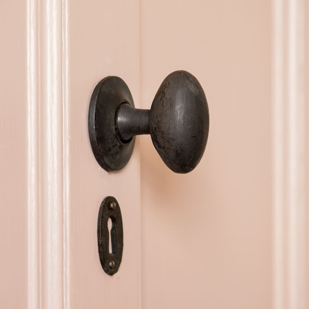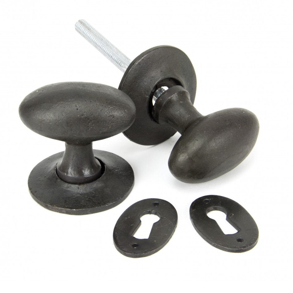 Solid black oval door handles that are made from cast steel with a beeswax finish. They can be used for either mortise or rim locks (remove one backplate when using with a rim lock). The spindle is threaded so the handles can be adjusted accurately depending on the thickness of the door. Each set comes with fixings and two escutcheons. As they are unsprung they would need to be used with a heavily sprung latch.