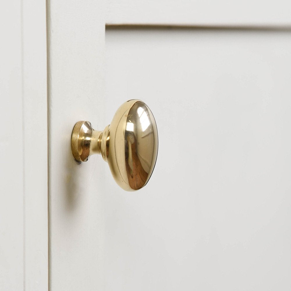 Crafted from solid unlacquered brass with a polished finish, this stunning small oval cabinet knob is lovely and weighty and extremely tactile. The knob sits on a large round backplate that can be removed for a more simple look.