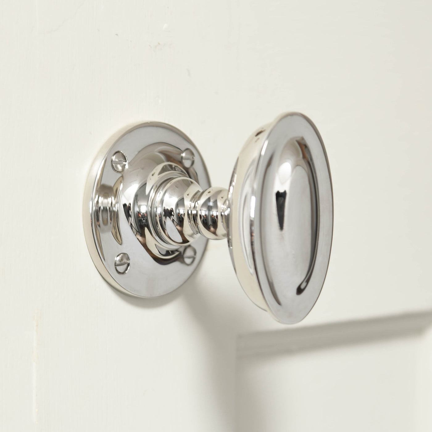 High quality oval door knobs that have lovely raised detailing in the centre of the knob. They are made from solid brass which gives them a strong weighty feel and finished in polished nickel. Would sit perfectly along side our oval Edwardian escutcheon.