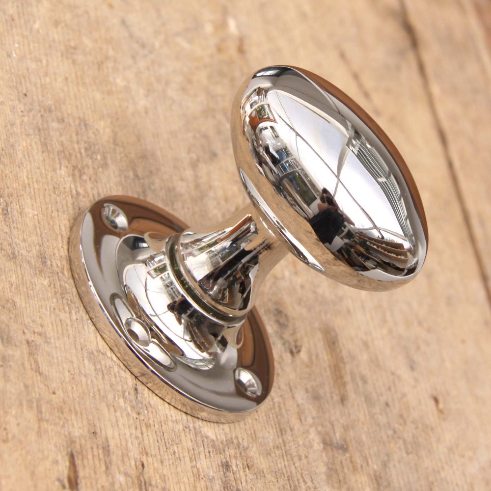 Beautiful oval door knobs that are hand crafted from solid brass with a polished nickel finish using traditional techniques. Available for use with either rim or mortise locks. Perfect for use in either traditional or contemporary homes.