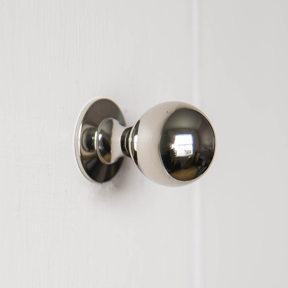 Beautiful round cupboard knob with fixed backplate. Available in three sizes to suit various styles and sizes of cabinetry throughout your home. Hand crafted in a UK foundry, these weighty cabinet knobs are made from solid brass with a polished nickel plated finish.