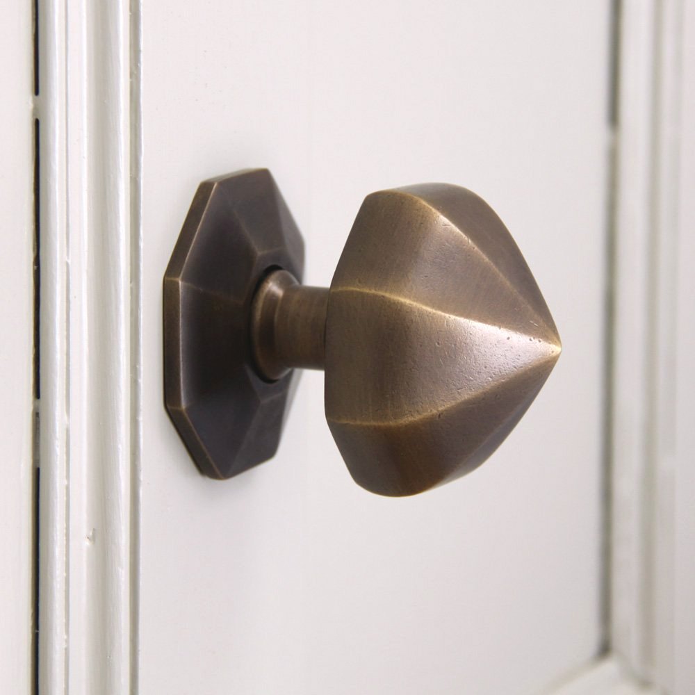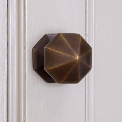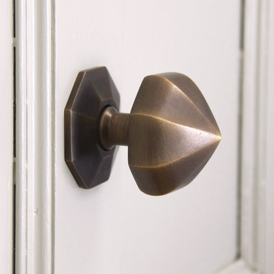 Superb quality solid brass pointed octagonal centre door knob with a distressed antique finish. This piece of door furniture is made using traditional techniques in the UK. The faceted detail that comes to a point makes it particularly elegant. Traditionally seen on period properties these would suit modern homes too.