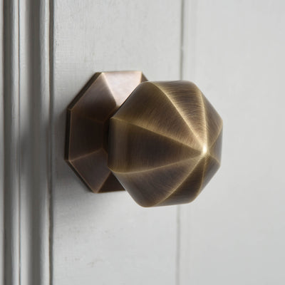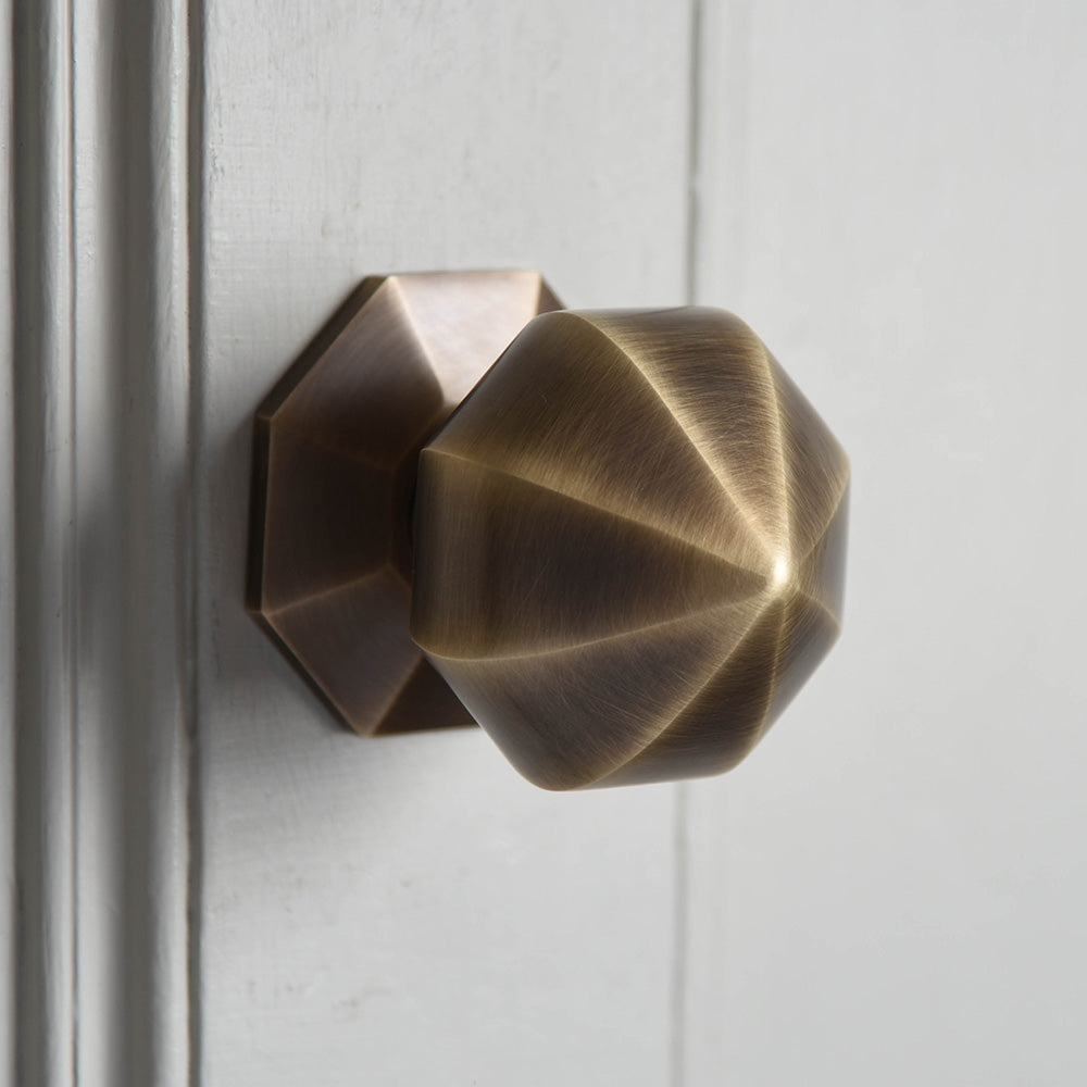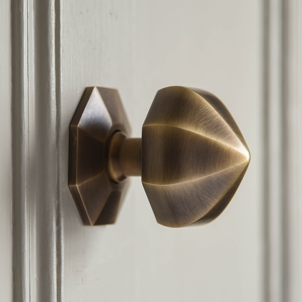 Beautiful octagonal centre door knob for your front door. Hand crafted in a UK foundry from solid brass with a light antique finish, creating a soft aged patina. Traditionally placed in the central panel of your front door to help pull your door closed.