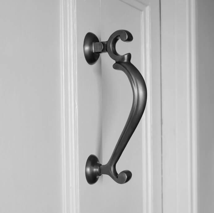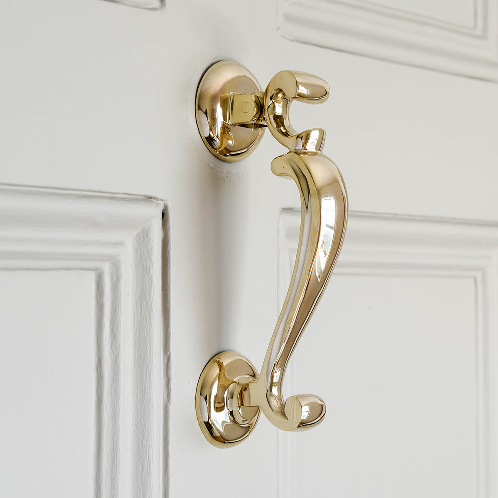 Extra large doctors door knocker that is hand crafted in a UK foundry from solid unlacquered brass. An elegant, slender design that that sits perfectly in the centre panel of the front door. Known as the 'Doctors door knocker' as it was once used to identify the doctors house in Georgian times. PLEASE NOTE: The image shows the standard size - the extra large is more elgonated. Second image shows proportions NOT the correct finish.