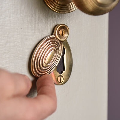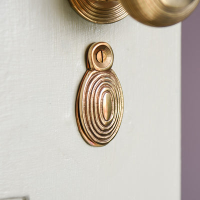 Solid bronze beehive escutcheon with a polished unlacquered finish that will continue to age authentically over time and gain a natural patina. This reeded oval style was popular in the Regency era and used heavily throughout the Victorian period and into the early 20th Century.