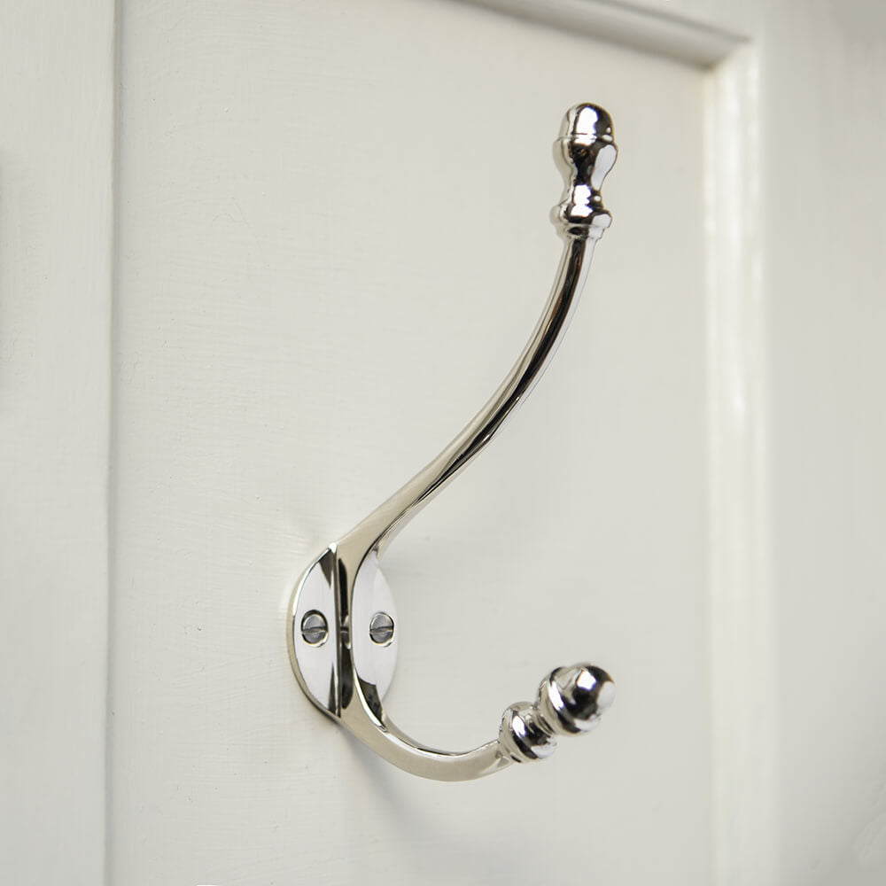 Practical hat and coat hook with stylish acorn detailing to the finials. Crafted from solid brass with polished nickel plated finish. This wall hook is ideal for hallways, bathrooms and bedrooms.