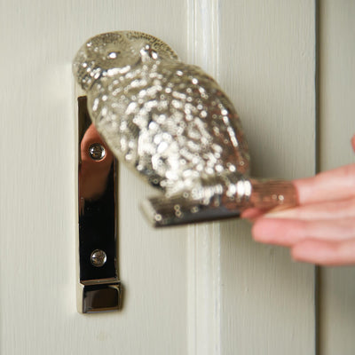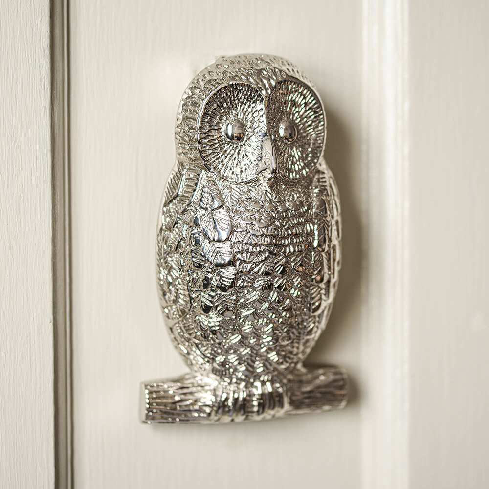 Polished nickel owl door knocker cast from solid brass and hand finished giving each piece individuality and detail. Striker plate and fixings all included, suitable for wood or solid core composite doors.