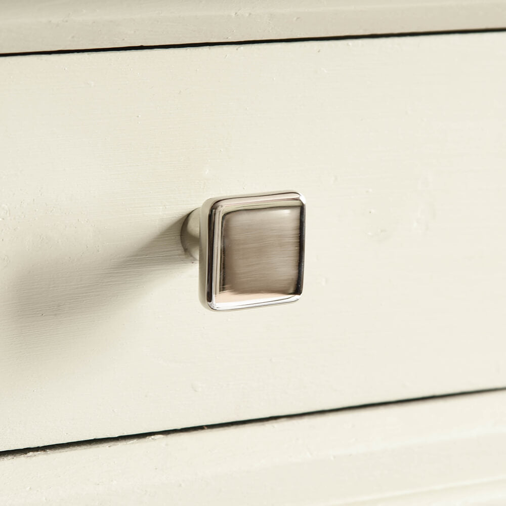 A strong and weighty cupboard knob that is made from solid brass with a polished nickel finish. Square with softly rounded edges. Perfect for adding a mid Century feel to cupboards and drawers. Would look great in a kitchen or bathroom setting.
