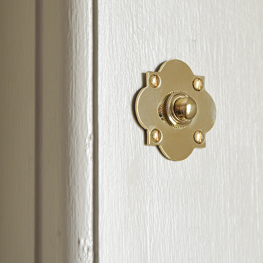Solid brass Quatrefoil Bell Push on cream wooden door.