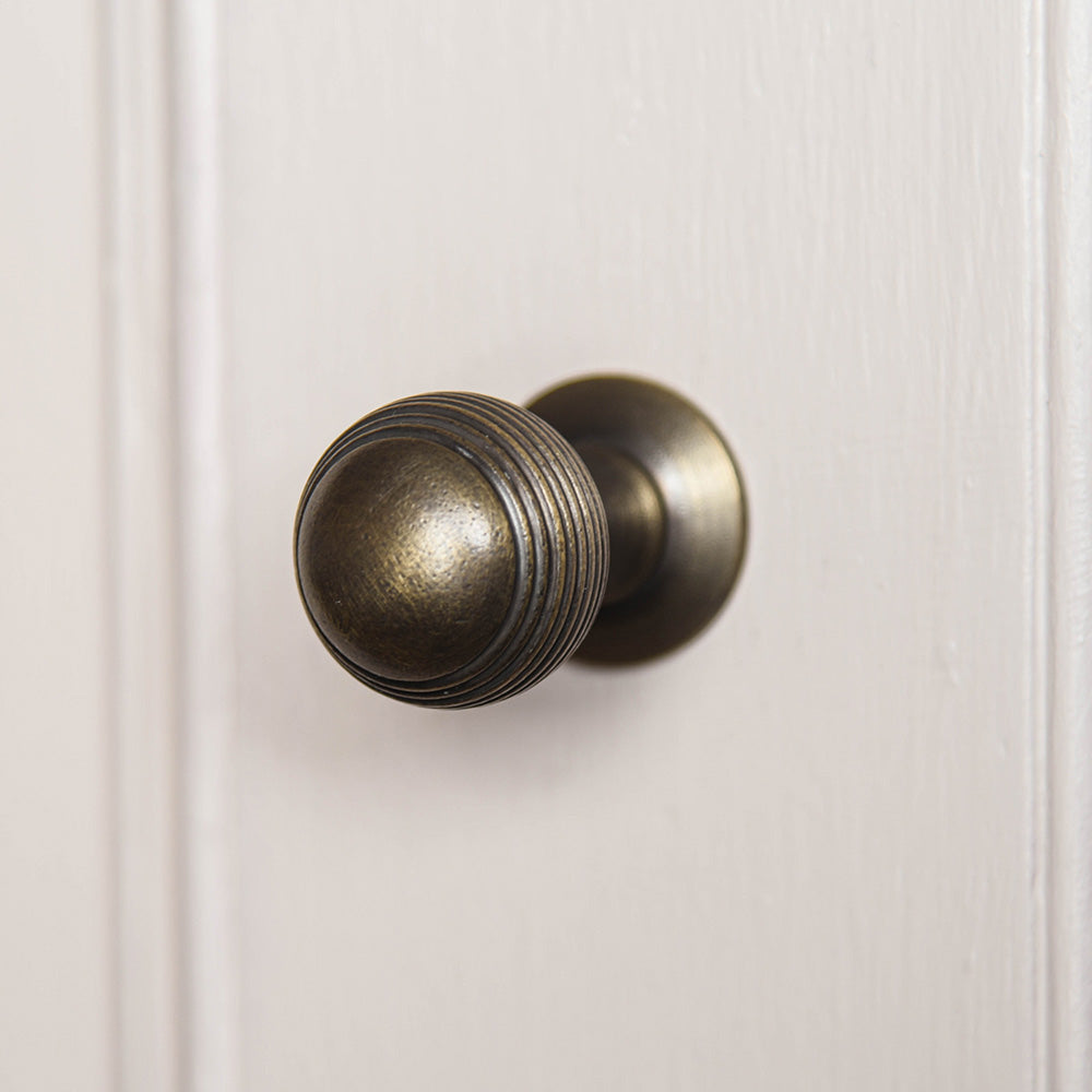 High quality cupboard knob with an elegant reeded beehive design that is made from solid brass with a distressed antique finish hand applied. A traditional design available in two sizes to suit your piece of furniture. Works beautifully when used on kitchen doors, drawers, wardrobes or fitted furniture.