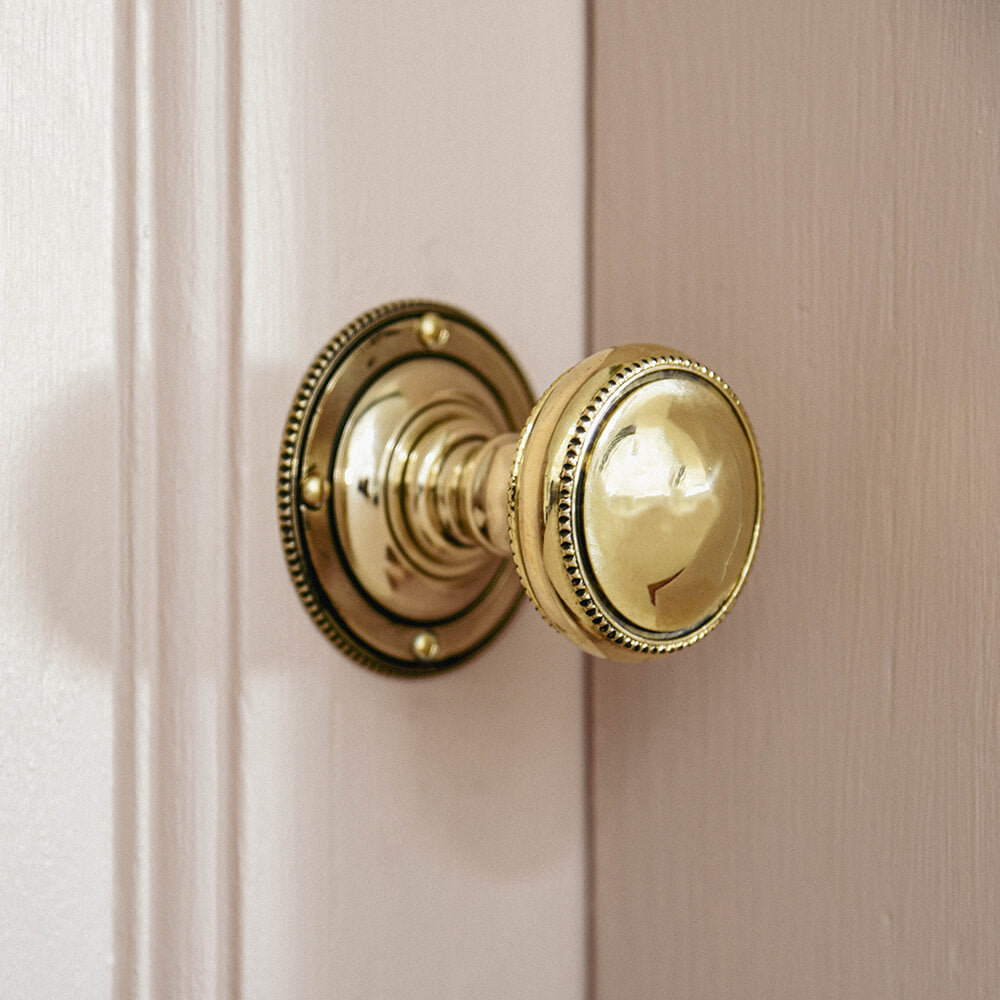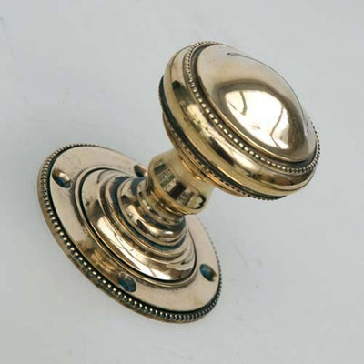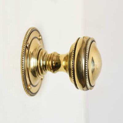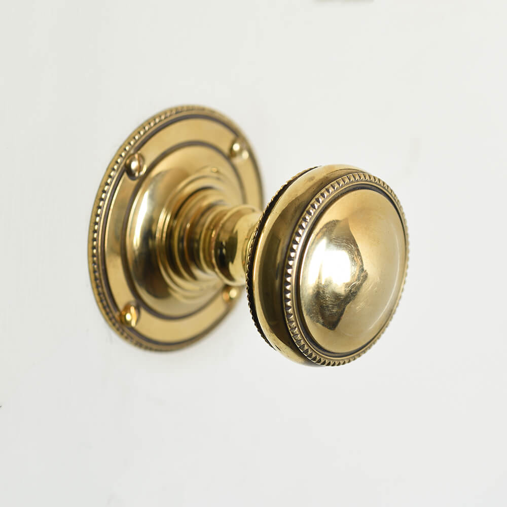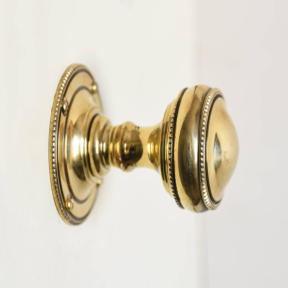 A pair of brass door knobs of slender proportions with an elegantly shaped neck and authentic beaded edge to the handle and rose plate. These handles have been applied with an ageing process that makes them almost indistinguishable from the original antiques. The blemishes, pitting and slight weathering to the brass are part of this process.