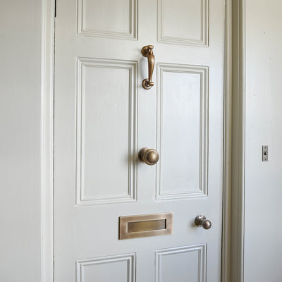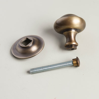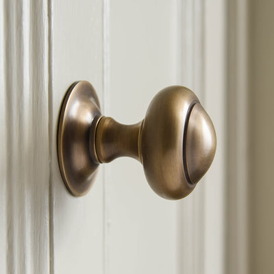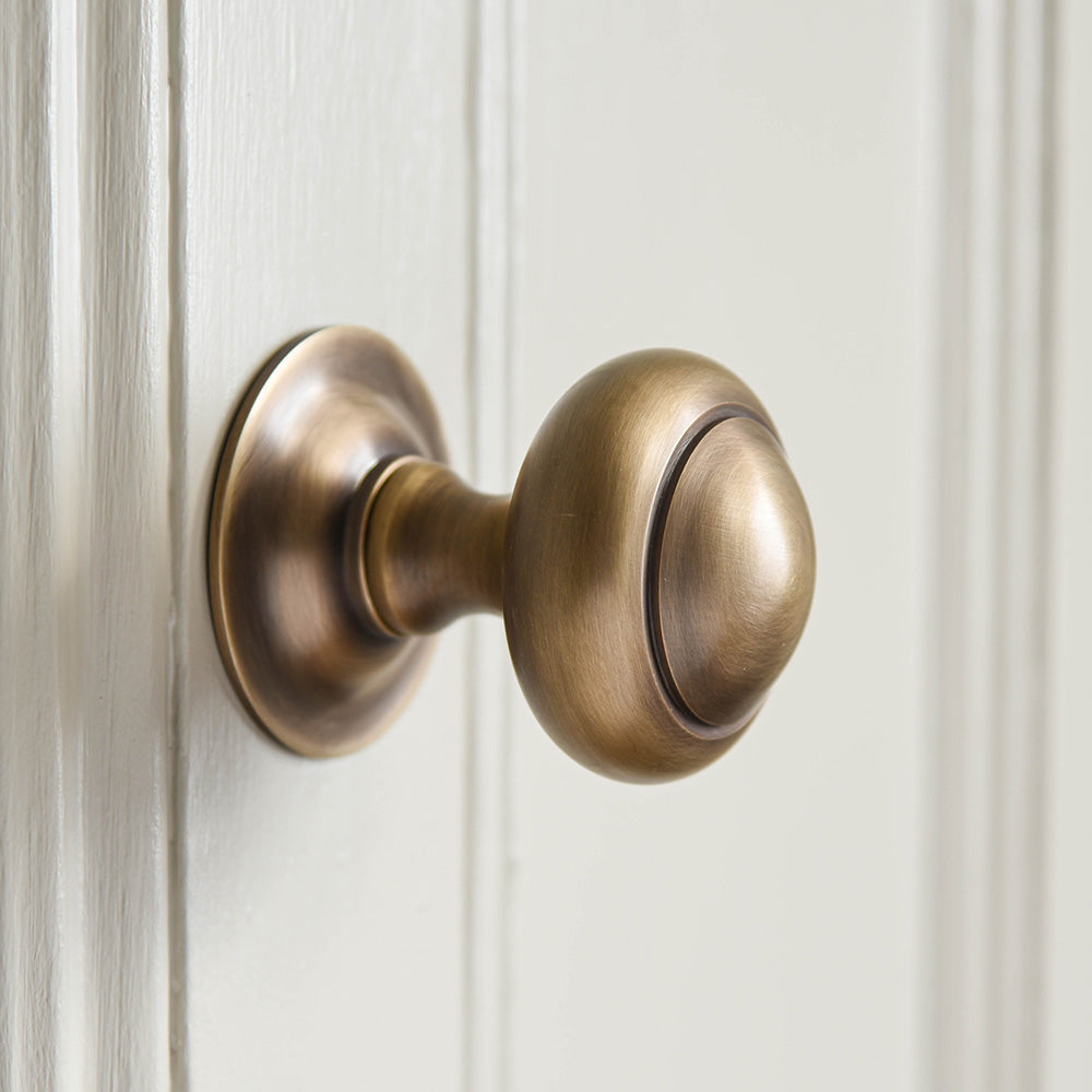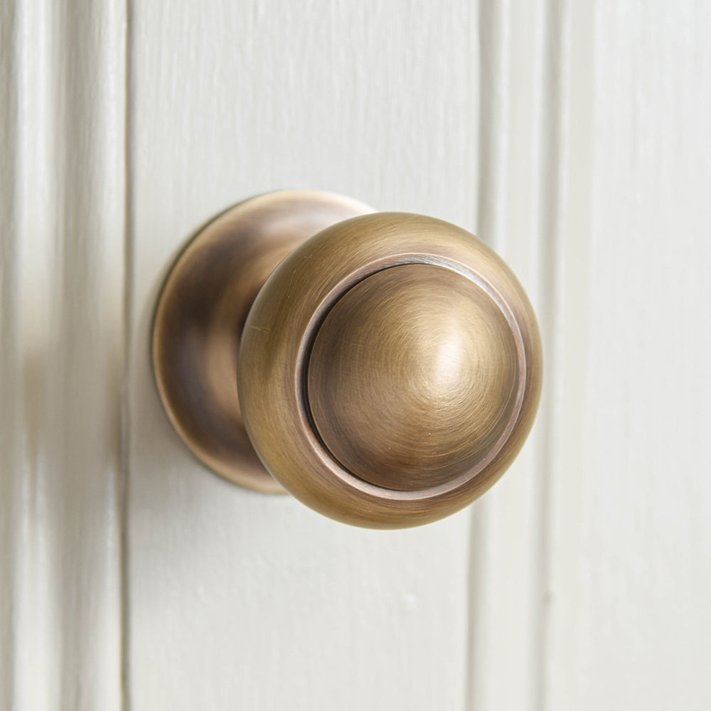 Traditional round centre door knob crafted from solid brass with a light antique finish hand applied. Designed to sit in the centre of the door to push and pull the door open and closed from the outside. Weighty and elegant this door pull will add grandeur to any entrance.