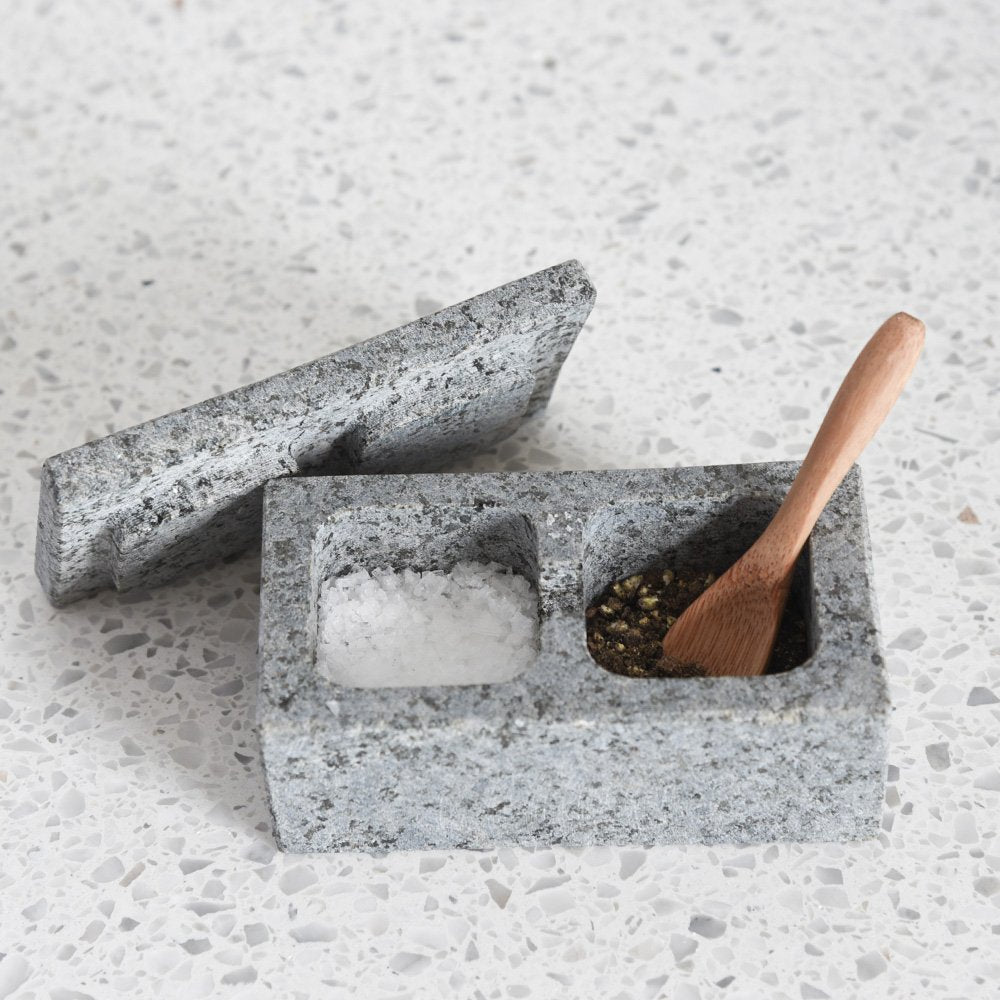 Keep this lidded granite salt and pepper pot with small bamboo spoon on the kitchen counter or dinning room table ready to season your meal. Rectangular in form with two compartments and a space to store the spoon when not needed. The lid sits on top keeping the contents fresh.