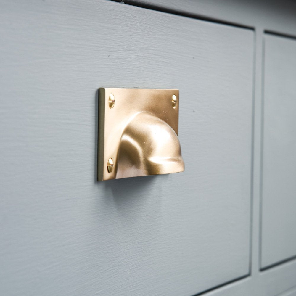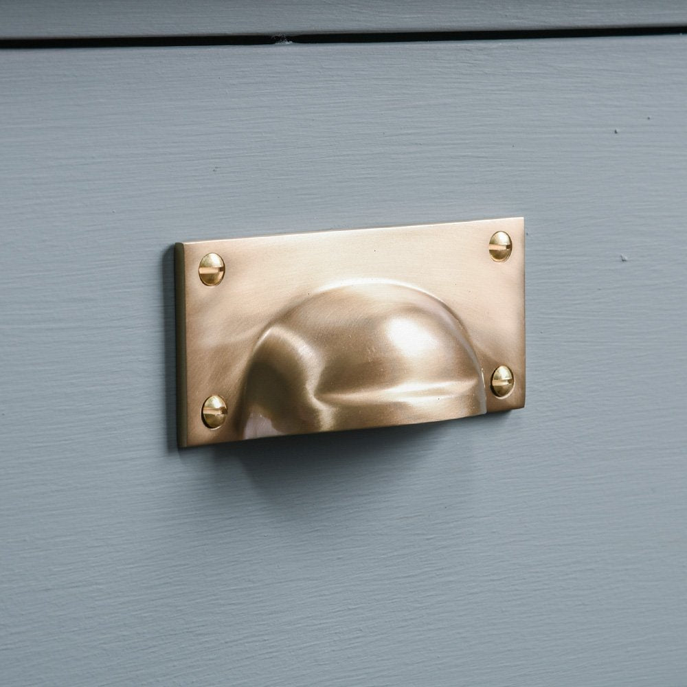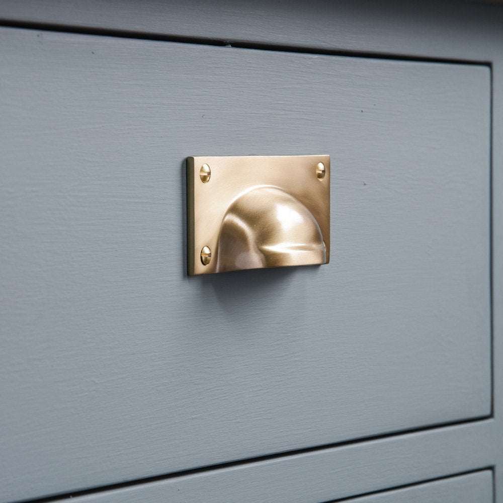 Solid brass hooded drawer pull with a rectangular backplate in a brushed brass finish. Weighty and substantial handle that is cast in a UK foundry and would be great for kitchen cupboard doors and drawers.