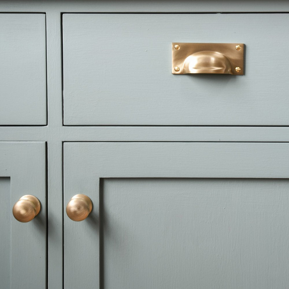 Solid Brass Hooded Drawer Pull in Satin Brass finish on blue drawer.