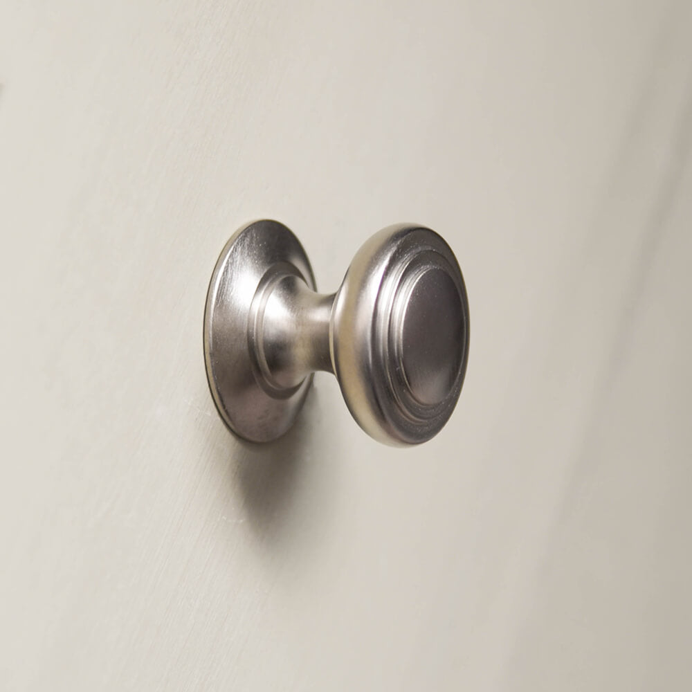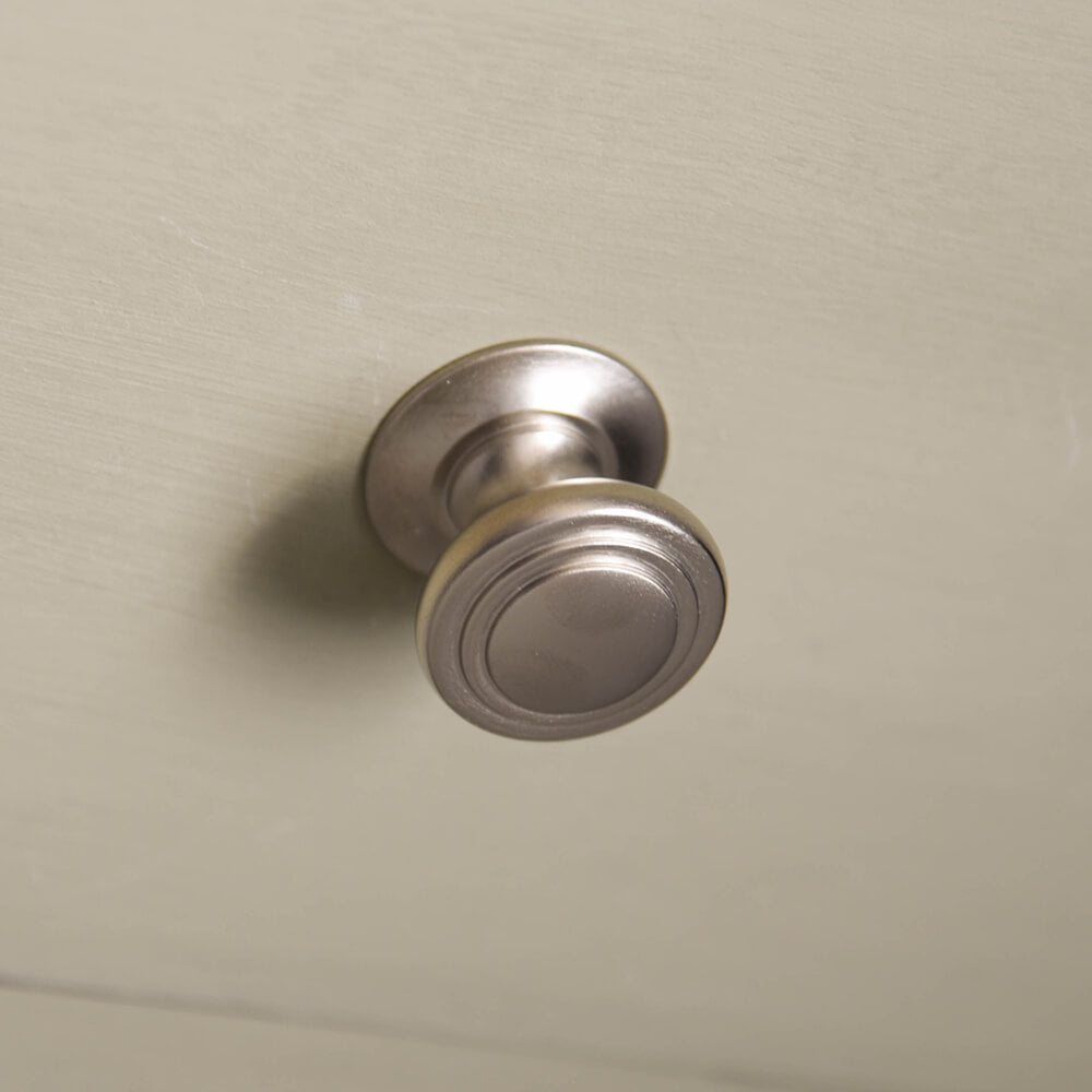 A beautiful cupboard knob finished in satin nickel. The stepped feature gives an elegant timeless feel and would look lovely on bathroom or kitchen cabinets.