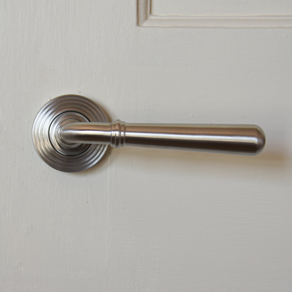 Satin stainless steeel lever handle with reeded backplate on cream door