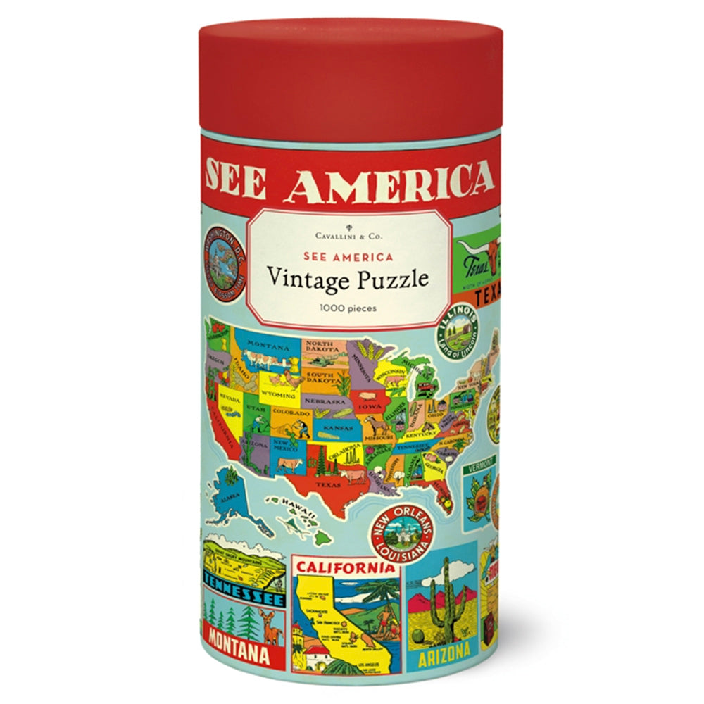 Enjoy assembling this colourful 1000 piece jigsaw puzzle that is filled with vintage style imagery of Americas states. Packaged in a tubular lidded box and the pieces kept safe in a drawstring bag.