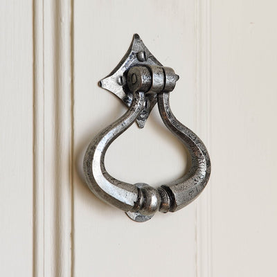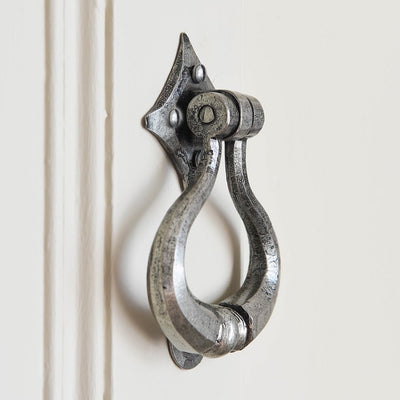 A stunning forged door knocker with a pewter colour finish. It has been drawn from one piece of mild steel bar which is then bent to form the ring revealing every hammer blow by skilled blacksmiths.