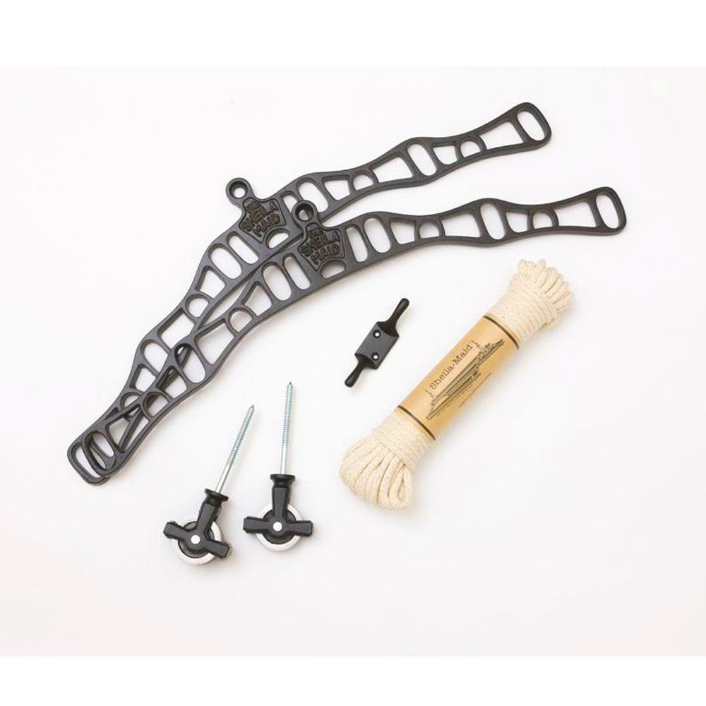- It comes complete with everything needed to install: wooden rails, 2 cast iron rack ends, a single pulley, double pulley, cleat hook and a 10m UK manufactured cotton durable rope