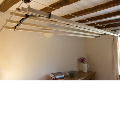 Traditional Sheila Maid clothes airer with 6 slats. The iconic energy saving 'Sheila Maid' clothes airer uses the 'Original Curved Shape' cast iron rack ends. This is the largest version that we stock and this design has been popular for over 100 years! A very useful item to have above the AGA or in the utility room.
