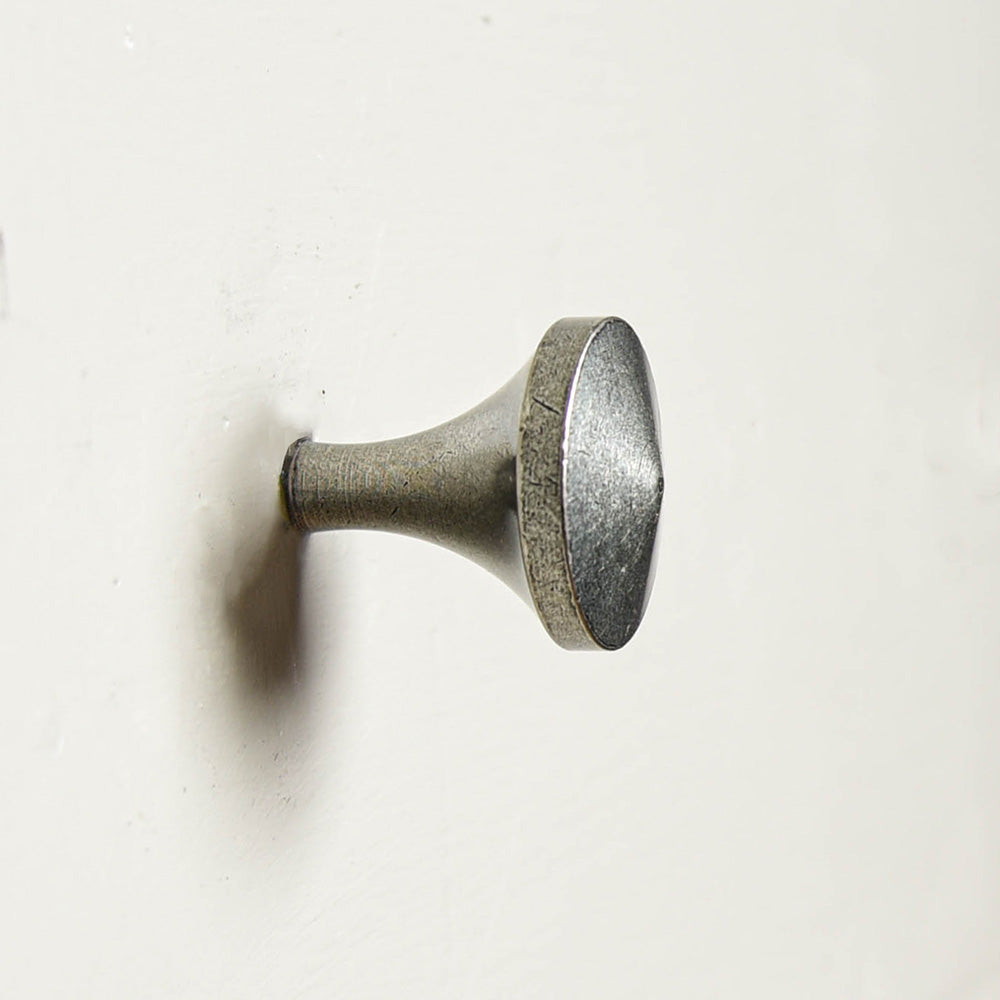 This stylish cabinet knob is made from steel with a pewter finish to give it a strong weighty feel. The curved base leads up to the circular top making it tactile to touch. This durable finish would be perfect for bathrooms and kitchens. Available in a small or large size.