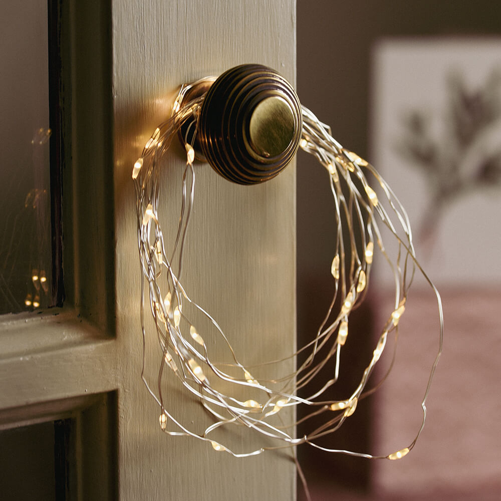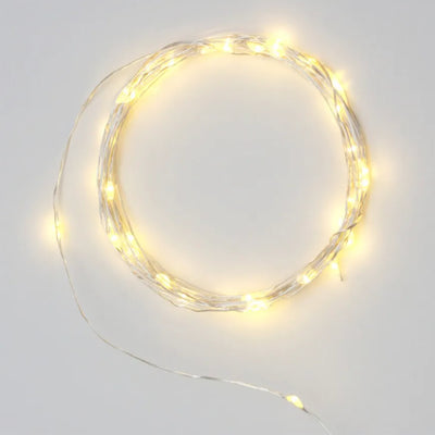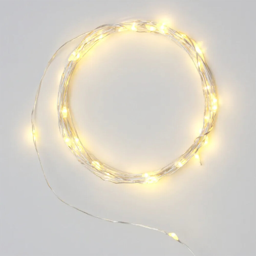 A length of 40 warm white LED lights on a silver wire. Perfect for hanging around the banisters, over a picture frame, in a vase or in the bedroom. They are battery operated and come with a built in timer for ease of use.
