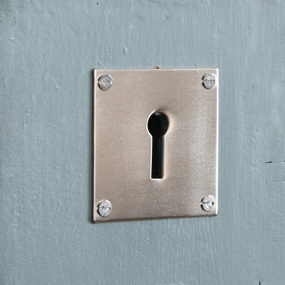 Superb quality large keyhole escutcheon in a square design. Crafted in a UK foundry from pressed solid brass with a brushed nickel plating. The large scale is ideal for making a statement but also helps to protect the door from the key scratching your wood or paint work.