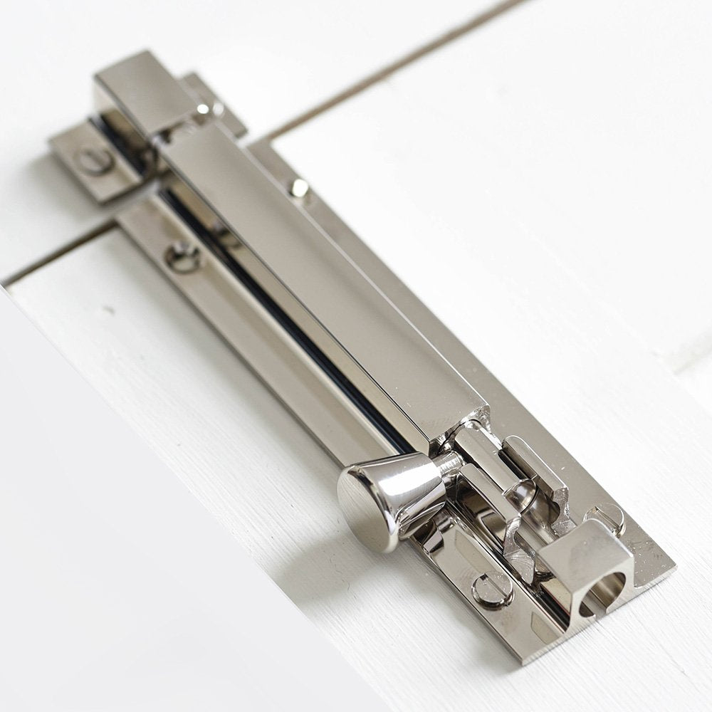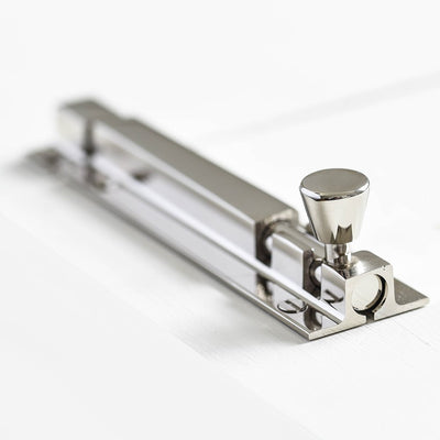 Elegant square section sliding bolt, perfect for use on doors or cupboards. The square profile and tapered handle is particularly appealing. Crafted in a UK foundry from solid brass with a polished nickel plated finish. Available in 3 sizes to suit a range of purposes.