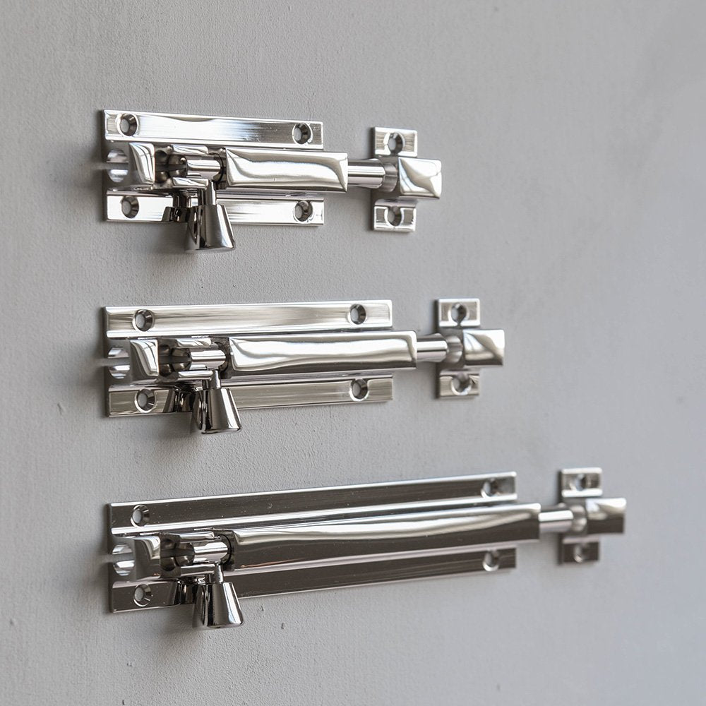 Square Section Barrel Bolts in Polished Nickel in three sizes ascending from the top.