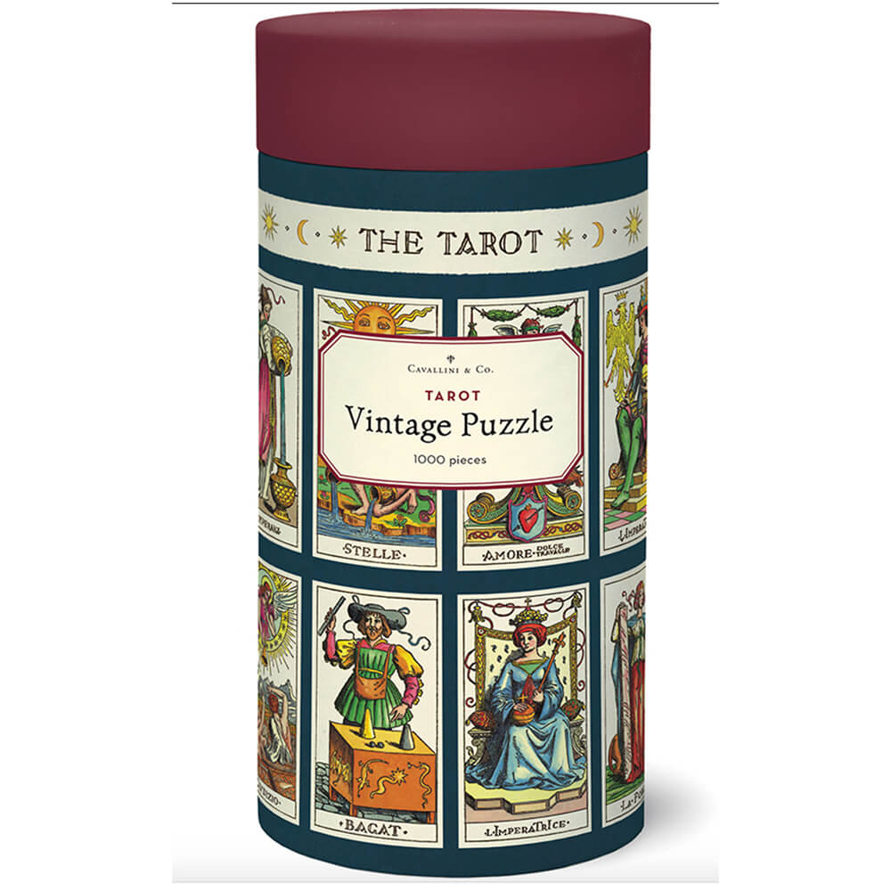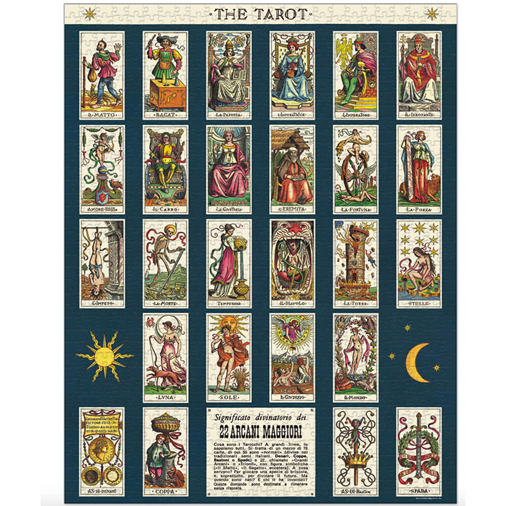 A 1000 piece jigsaw puzzle depicting different vintage tarot cards and their French descriptions. Also includes a drawstring bag and mini poster of the image.