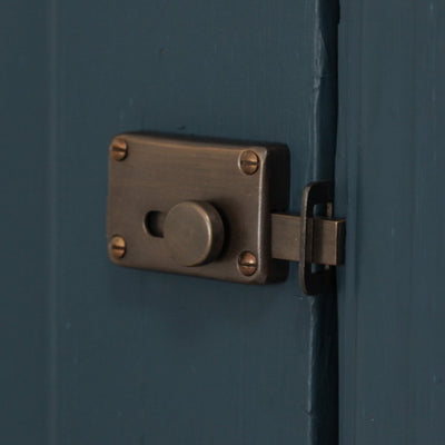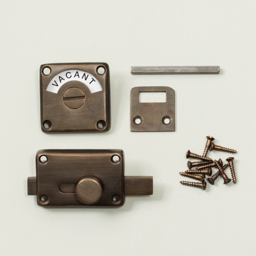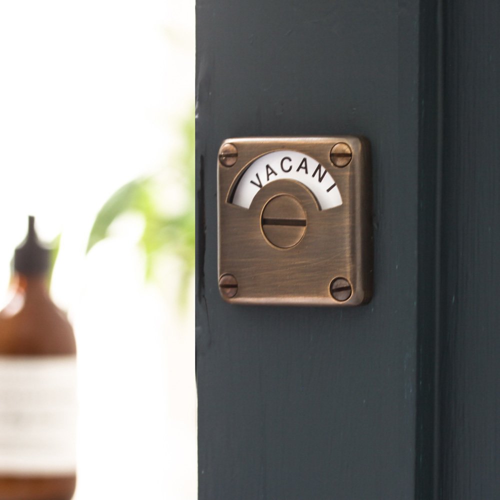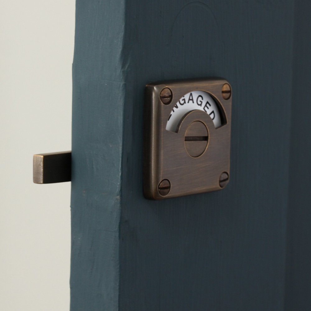 Gorgeous toilet door lock that is also known as an indicator bolt. Crafted from solid brass with a distressed antique finish in a UK foundry. The originals of these classic early 20th century toilet locks are now highly sought after. Perfect for use on the bathroom or toilet door. Features a interior sliding bolt which spins the dial with ease.