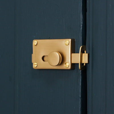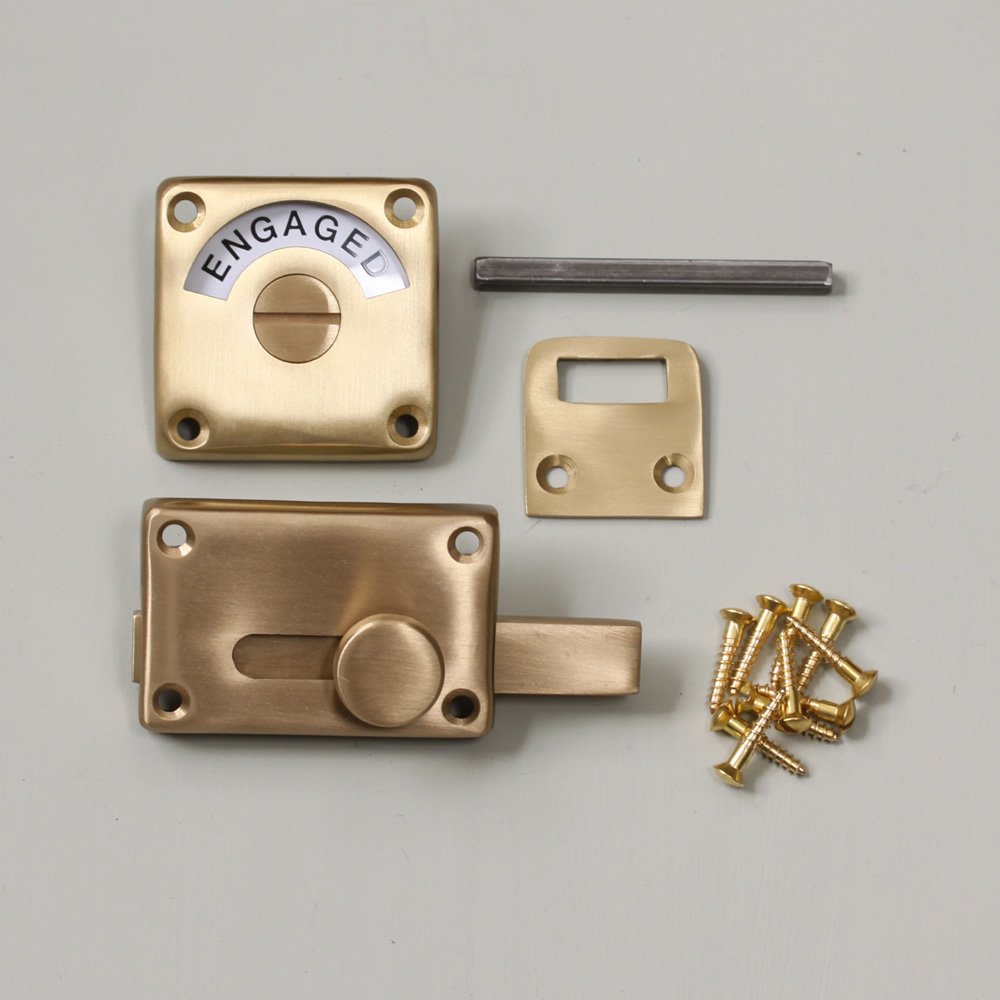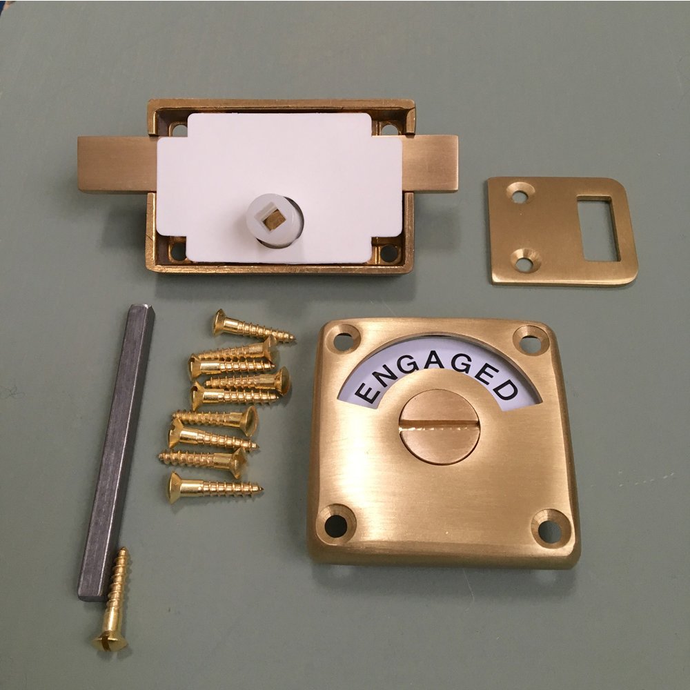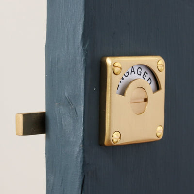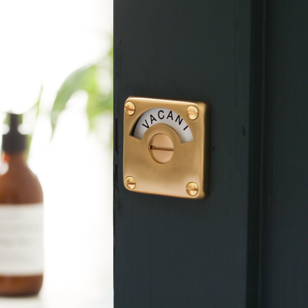 High quality vacant engaged lock that is also known as an indicator bolt. Crafted from solid unlaquered brass with a satin brushed finish. The originals of these classic early 20th century toilet locks are now highly sought after. Perfect for use on the bathroom or toilet door. Hand made in the UK and features a slide action bolt which spins the dial with ease.