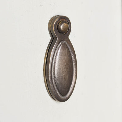 Beautifully crafted solid brass keyhole escutcheon with cover. Finished in a distressed antique finish which is hand applied to give an authentic feel. The cover swings with ease and the simple oval design with groove is typical of the regency era. Would suit many of our door knobs from the same range.