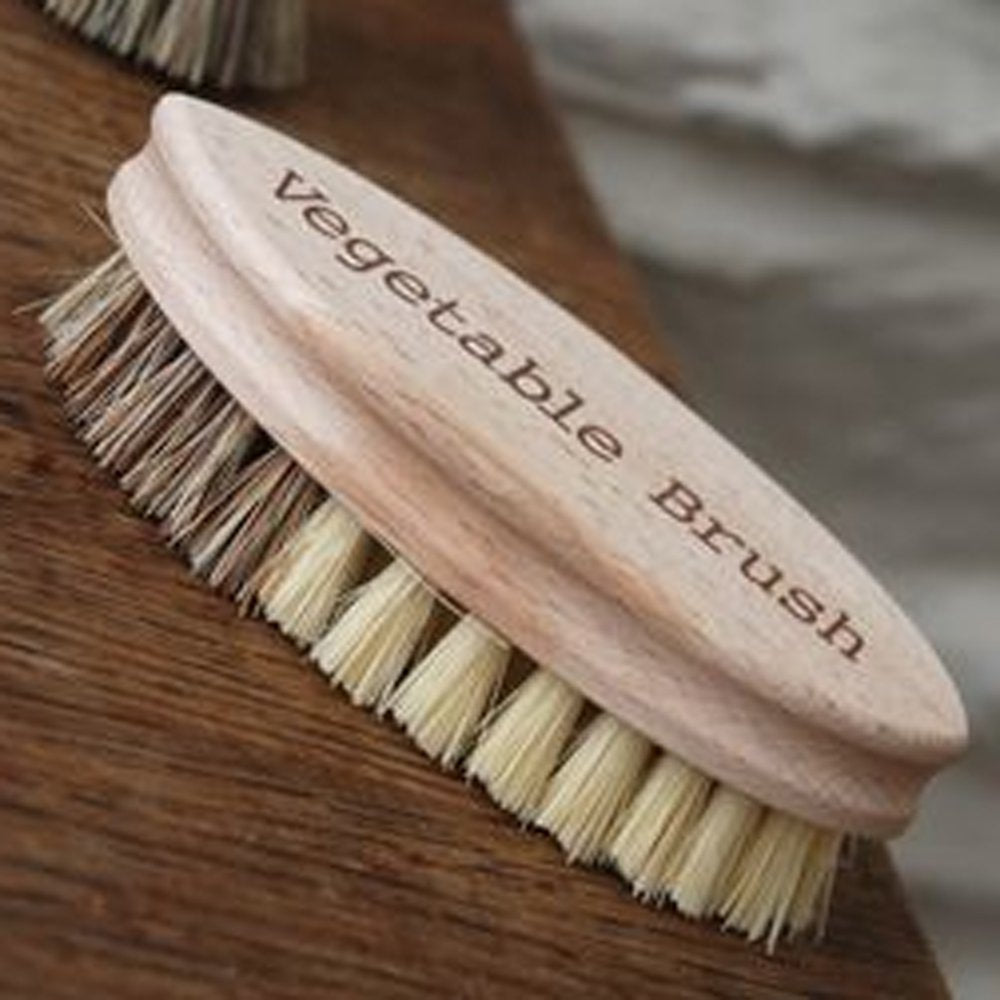 A smart wooden vegetable brush inscribed 'Vegetable brush' to the top. These brushes have stiffer bristles to one end for cleaning potatoes and other root varieties and the other end has softer bristles for more delicate vegetables.