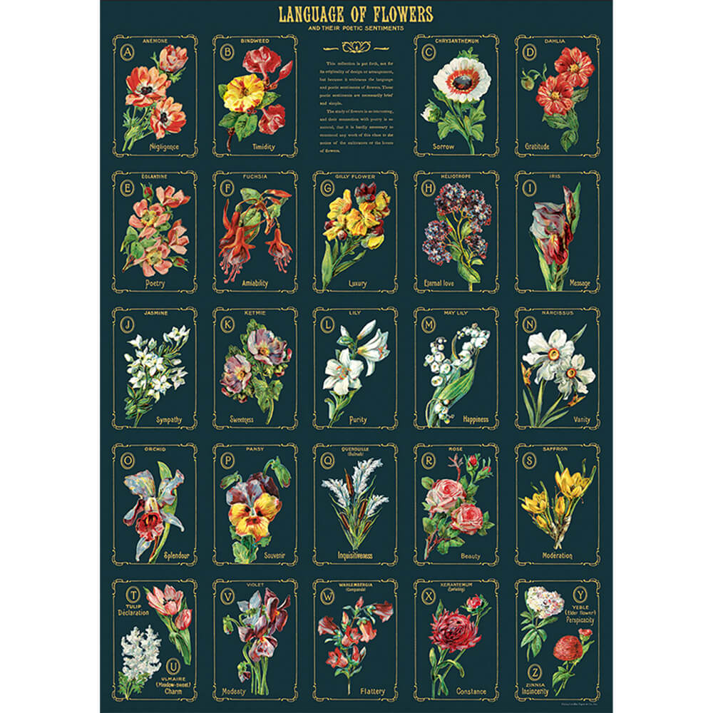 Language of Flowers A2 poster depicts 24 beautiful species of flowers and their floriography, where each flower represents specific sentiments and emotions. Imagery from vintage archives.